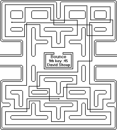 This is my best and favorite 9th key pattern. It's fast, quite stable, and it's easy to notice if you are off pattern well before a collision. It saves the stairsteps above the monster box and at the bottom till late in the pattern (spots where it's easy to make a tiny mistake). There is one apparent close call with Blinky where he goes against his usual behavior and turns away when he is right on Pac-Man's tail, but the coolest part has you charging Pinky right before a reverse, "scaring" him off into the tunnel as he Bounces into Inky sending him in the other direction, you have to see it it's pretty cool. I recently modified the ending to an even safer solution. It clears the board in 45 seconds.