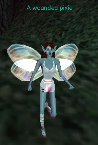 A wounded pixie says, 'Thank you very much. If you could fetch me a bandage I could mend my wounds and be on my way. Please bring me back a bandage before any of the wolves find me.'