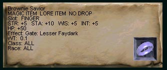 Ok I dont know if VI is trying to be funny or what but here's what happened... Im walking through LFay with my chanter to buy some of the mana spells from the brownies when I come across this brownie right outside the town roaming around. I'd never been to Lfay much so I didnt know if this was normal or not so I hailed her and she started blabbing out a quest....I thought this must be some GM event or something because it was just so slapstick and off the wall...who knows but I've only seen her twice and it was both the same day. I went back to check her out with my Iksar / SK just to see if she was still up and she was and conned indiff to me so she must be on beta/nuetral faction. This is funny so here's the start of the quest...