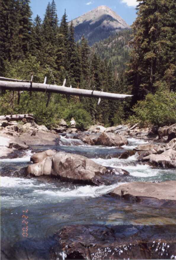 After catching our share of smaller fish in the pocket water near our camp, the next day we went in search of some deeper pools. The scoutmaster of the troop that decided to camp way too close to us said that there was a really deep pool up at the Johnson Creek Trail. We threw a lunch and our fishing gear into my pack, and hiked another mile and a half up to the bridge to check it out. Sure enough, it was very deep, and inhabited by some larger trout hiding 15 feet below the surface. We spent the day trying our luck for these trout, and exploring the area around the bridge. This area does not have as many good fishing areas as the pocket water below, but the views are just astounding. The Needle Mountains tower over you to the northwest, including the 14,000 foot Windom, Sunlight, and Elous peaks.