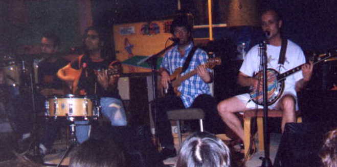 I am actually a new fan of theirs. I am forever indebted to Jacob, for having me listen to their cd while we were in Germany this summer, because I would still be ignorant of their existance if he hadn't. Until this summer, I had only heard "My Baby Loves A Bunch of Authors," off of 88.5 WXPN, and liked the song but didn't know who sung it, or that they had other albums out. In the airport, waiting for the plane to Germany, Jacob played me "King of Spain." Thus, I became aware of the existance of Früvous! When I got back to the states, I was in a used Cd shop cruising the racks when I saw "Bargainville." I snatched it up, and started REALLY listening to them. Then, on a car trip up to visit my Grandmother (who lives in Rochester), I played the cd for my family. Imagine our surprise when we got there, and the paper in the pizza place said that Früvous was preforming a sold-out concert at the Milestones (the local concert place), but that they were doing a free acoustic set at Archive Records! Needless to say, I went, and to my further astonishment discovered that this was the day that their new album, Thornhill, came out. I HAD to buy it! They proceeded to play a set that was close to an hour long, and then had a signing session. (My liner to Thornhill is now autographed by all four band members!)