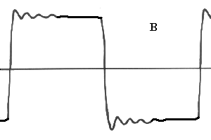 The first looks like sustained low level oscillation around 30kHz, while the second looks like damped oscillation at the same frequency. Actually the first diagram has nothing at all added to the square wave, the only thing done was to remove everything above the 15th harmonic. Everything up to and including 30kHz is being reproduced with no distortion, no phase error and flat frequency response. (If possible see 'A check on Fourier' by M.G.Scroggie, Wireless World, Nov 1977. p79-82. His Fig.5 is a better drawn version showing the harmonics and how they add.) The lack of higher frequency components however gives the impression of a serious problem, when in fact the audio frequency reproduction is perfect, and there is nothing at all added or removed in this range. The symmetrical variation of the 'oscillation' amplitude gives a clue to the origin of the effect, but practical low pass filters give a less sharp cut off of high harmonics together with frequency dependant phase shift which will give a different appearance. The suggestion that 'ringing' needs to be minimised is not entirely convincing when even an ideal low-pass filter gives the above result. Using an audio signal with no frequency components above 30kHz instead of the square wave there would be no effect at all from this filter.