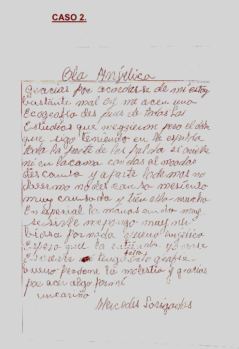 Se trataba de una consulta hecha por una persona de 65 años. Al recibir la letra presentaba numerosos signos de falta de salud y de deterioro gráfico de forma alarmante.Esta escritura fue traída por la nieta, se le pregunto si su abuela tenía algún problema de salud importante, ante lo cual respondió que no. No conformes con la respuesta y para hacer un diagnóstico diferencia adecuado se le pidió que su abuela completara el cuadernillo de preselección . Al decepcionarlo nuevamente ya completo confirmamos nuestras observaciones grafológicas. La abuela tenía al momento de escribir un cuadro bronquial importante además de una artrosis. Todos esos signos de deterioro correspondían a su avanzada artrosis mas que a una enfermedad grave como su letra hacia sospechar.