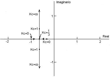 2. Cuando Kc = 0, los lugares de raíz se originan en los polos de la FTCA: -1/3 y -1.