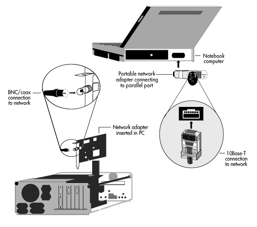 The connection hardware used to make connections between network adapters and different transmission media depends on the type of medium used. For example, twist-on BNC connectors are commonly used for connection to coaxial cable, while snap-in telephone-like RJ-45 jacks are ordinarily used for connection to twisted-pair wiring. Figure 2 shows two different types of network adapters connected to different computers and media, using different types of connectors.