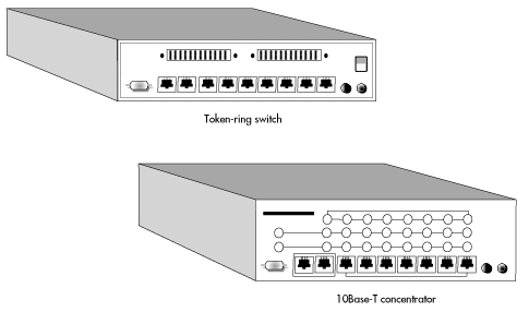 Figure 3 shows two common hardware-based connection devices: a token-ring switch and an Ethernet 10Base-T concentrator.