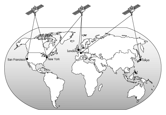 Microwave transmitters and receivers, especially satellite systems, are commonly used to transmit network signals over great distances. A microwave transmitter uses the atmosphere or outer space as the transmission medium to send the signal to a microwave receiver. The microwave receiver either relays the signal to another microwave transmitter, which sends it to another microwave receiver, or the receiving station translates the signal to some other form, such as digital impulses, and sends it along on some other suitable medium. Figure 4 shows a satellite microwave link.