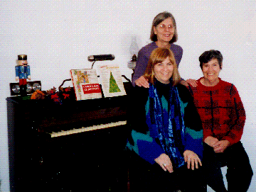 GATHERING OF THE CLAN Three of the four Lynch Girls gathered at the Pearson home in Alexandria, Virginia, for the Christmas season in 2001. Standing is Mary Lynch Hernandez. Seated from left are Kate Lynch and Connie Lynch Pearson. Sister Zizi Bazz is in Thatcher, Arizona. The piano -- a Gulbransen spinet -- was purchased by Mother Marion Doyle Lynch in the late 1930s. All four Lynch sisters learned to play on this piano.
