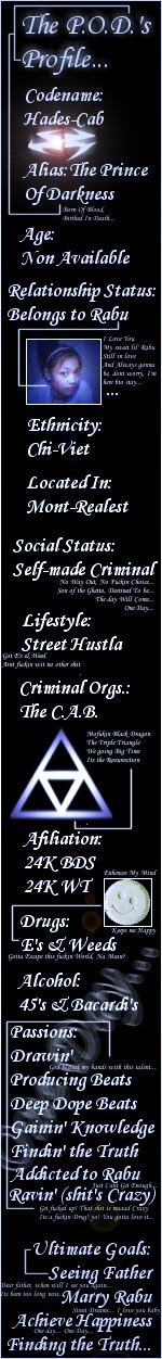 I wanna have my family back together, iwanna see my father, i wanna have my brothers back together, i wanna have a better mind, i wanna survive, those poisonous fuked up streets, i wanna get old and get marred and raise a family, i wanna be happy, i wanna live... Cuz this mothafukin life, is not suposed to be like this! y`all Real mothafukaz out there feel me???