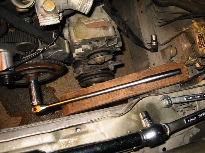 Once this bolt is off and you've done your business, the time will come the reinstall it. You can't do it the same way you took it off, because the engine only turns one way. To reinstall the bolt, you'll need something to hold the crankshaft steady with while you tighten the bolt. Bentley recommends BMW special tool # 11 2 150. Very helpful. Since no one has this tool or is going to buy it for $70 from the dealer, another method of removing the bolt is necessary. Wrap your old timing belt around the teeth on the vibration damper and clamp it tightly with vise grips. Now rotate the crankshaft clockwise, using the crankshaft hub bolt, until the vise grips are wedge in under the water pump. Use you breaker bar (or a big torque wrench if you want) to tighten the bolt. I was able to put about 125-150 ft-lbs on the bolt before I started to get nervous about the water pump. I spoke with a mechanic at my BMW dealer, and he said that 150 ft-lbs is plenty as long as I put locktite on the threads. So I picked up some blue (medium) locktite at O'Reilley's and satisfied myself with 150 ft-lbs. I haven't had a problem since and don't expect I will.