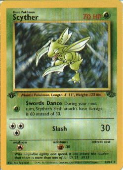 Some trainers think that Scyther is one of the best Pokemon in the whole game. Scyther is a Basic Grass Pokemon with 70 Hit Points. It has two attacks that wotk very well together. Swords Dance doubles the damage Scyther will do on your next turn. Slash does 30 damage. Used together, these two attacks can ambush many unsuspecting Pokemon. Just use a well-timed Gust of Wind to move a Pokemon from your opponent's bench into Scyther's line of fire.
