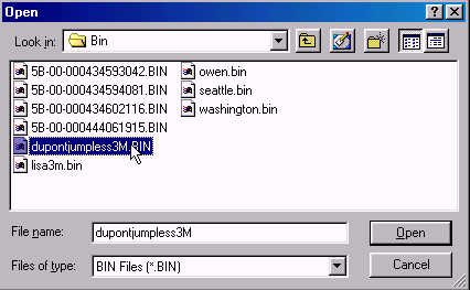 It will then ask you to look for the file you would like to write to the card. If it is not in the first folder you see, you will need to click on the drop down box beside where it says "Look In" and you will need to find the .bin file you downloaded from the website. If it is not in the Bin folder it will most likely be located on your desktop or in your "My Documents" folder. When you find the file double click on it to proceed.