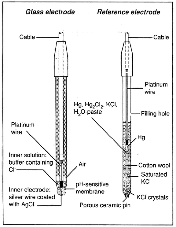 ภาพข้างล่างเป็นตัวอย่างโครงสร้างของ glass electrode (indicator) และ calomel electrode (reference) ที่ใช้กันอยู่ทั่วไปในห้องปฏิบัติการครับ