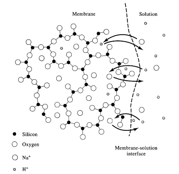 ทีนี้เรามาขยายความเรื่องของ glass membrane กันอีกนิดครับ "เยื่อแก้ว" นี้จะให้ประจุบวกบางชนิดผ่านเท่านั้น อย่างเช่นในกรณีของ Corning 015 glass ซึ่งมักนิยมใช้กันใน pH electrode ประกอบไปด้วย Na2O 22 %, CaO 6%, SiO2 72%