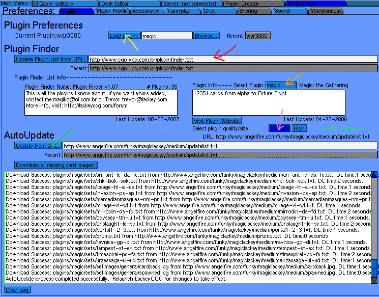 9. When all of the files are done downloading, Lackey will report "Relaunch LackeyCCG for changes to take effect", like in the picture above. Click the "Load Plugin" button, pointed to by the yellow arrow in the picture above. The field next to this button should now have your plugin's name in it. (If it does not say the name of your plugin here now, use the "Browse..." button to select your plugin.)