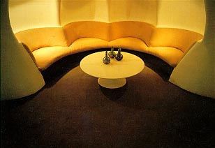 Another approach used by the Deans to adapt the interiors of existing rectilinear structures is to employ fiberglass, fabric, and foam composites to form an organic interior landscape almost like a form of soft-sculpture. This approach grew from their work on stage set desigs and in the interior design of night-clubs. The technique involves designing an interior space much as with the rigid shell materials but within the confines of the rectilinear boundaries of the existing structure then executing it in foam filling in and concealing the square corners. It's almost as though the structure were entirely filled with foam and then the new spaces carved out. The foam is then covered with a variety of sewn fabrics. Seating spaces and tables are created from the base foam material as foam composites using foams of different density and hard rigid materials for support or hard working surfaces. The approach is not as efficient as the rigid shell techniques due to the volumetric losses from the original rectilinear structure but can be readily combined with the rigid shell approach.