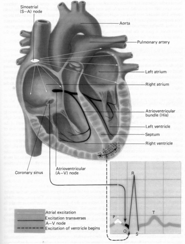 The heart's internal control mechanism consists of specialised fibres including the sinoatrial (S-A) node, located on the rear wall of the right atrium, the atrioventricular (A-V) node, the A-V bundle, and the left and right bundles of conducting fibres (Guyton, 1977). The S-A node is known as the pacemaker, with a rate of 120 bpm at normal body temperature. However, the vagus nerve (the Xth cranial nerve) inhibits the pacemaker and holds the rate down to between 70 and 80 bpm. The contractional impulse is slightly delayed at the A-V node before passing into the ventricles, and the A-V bundle then conducts the impulse into the ventricles. Fibres known as Purkinje Fibres conduct the impulse to all parts of the ventricles.