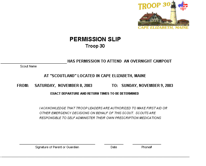 The permission slip shown here may be a generic version. As we approach sheduled events that require permission slips, this form will be updated with location, dates and other details.