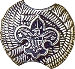 Left Pocket. Service stars above the pocket. If a medal or embroidered knot for youth members is worn, service stars are raised. Embroidered square knots are worn centered above the pocket in rows of three. The wearing sequence is at the wearer’s discretion. Badges of rank are worn centered on the pocket above the Arrow of Light Award. Flap buttoned. The world crest is worn centered horizontally over the left pocket and vertically between the left shoulder seam and the top of the pocket.