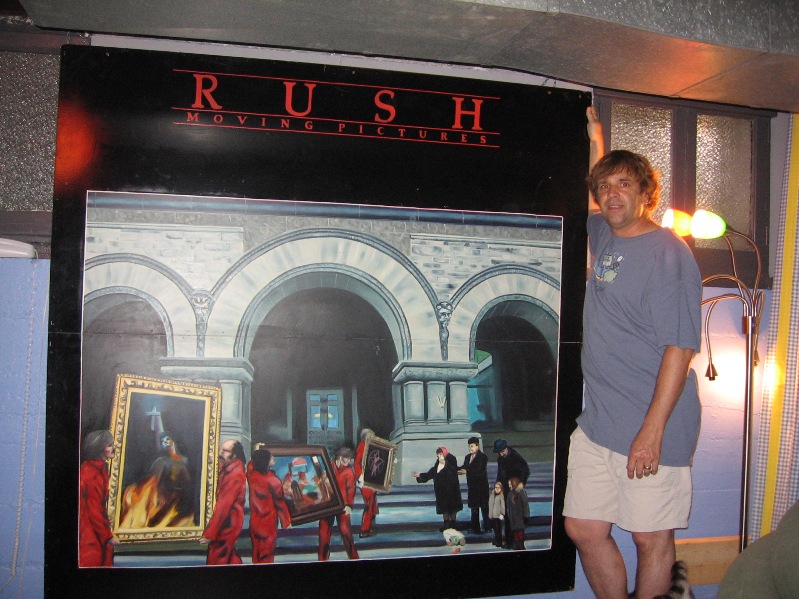 Steve found one of the other 6x6 foot artboards. This Joe Jackson one a friend of mine has it and I didn't remember I gave it to him until one night in January, 2010, when I was at his house and saw it! (I know, I GAVE it to him. I must have been out of my mind!) In moving it around, at some point, he put a hole in it! At first, I thought it was the one Fred punched in the back room, but after looking at the video we took, that was a Squeeze album board.