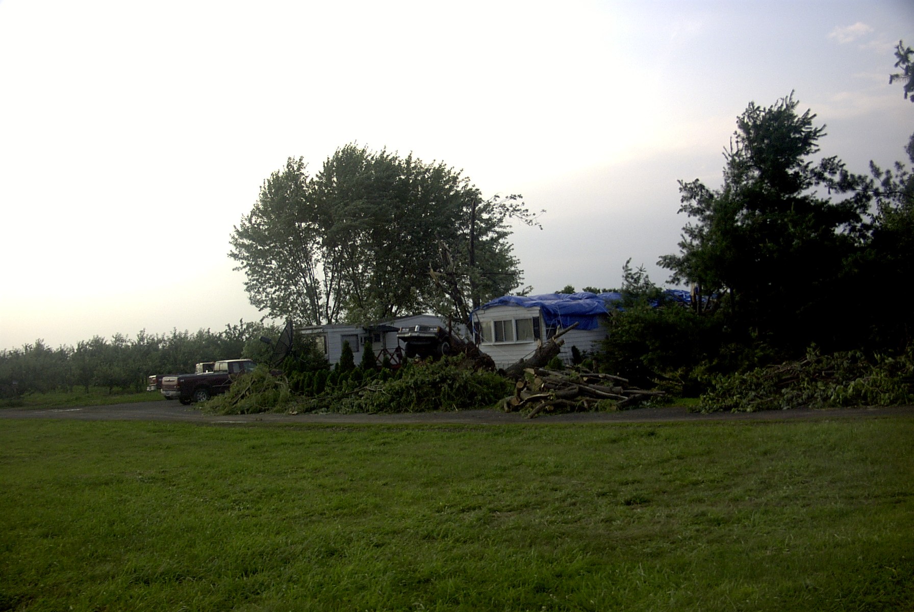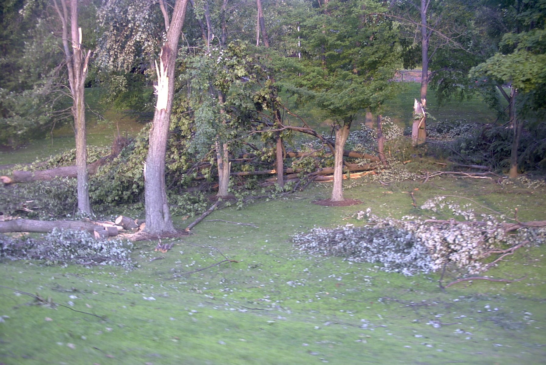 Another view of the same yard above with a tree that was snapped in the middle being in the center.