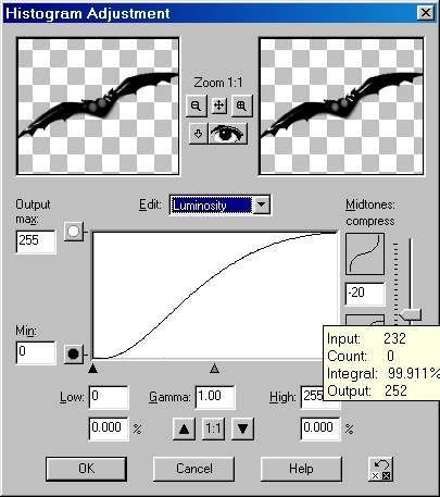 Go to Colors, Histogram, Histogram Adjustment and use the settings shown below (don't' worry about the bats in the below screenshot, these are the correct settings for your image :)
