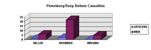 Among the wounded at Deep Bottom was Captain James P. Quinlan, of company E. Company K lost Private Edward Steinbeck at Petersburg because he was wounded. On August 17, division commander General Barlow became ill, allowing General Miles to replace him and Colonel James Lynch (183rd PA) to replace Miles in brigade command.