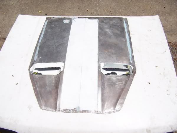 To fix the scoops onto the actual bonnet, I used rivots at regularly spaced intervals. It would be better to weld it, but I have no welding skills whatsoever (To be honest I don't even know how to turn on welder let alone use it!). Welding would mean that less finishing is required once the scoops are fixed to the bonnet. Below are a couple of pictures of what the bonnet looked like at this stage, just after the scoops had been rivoted on.