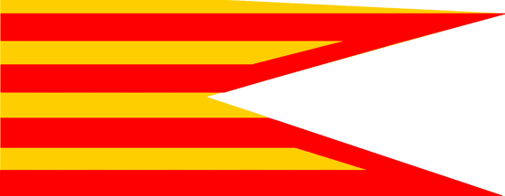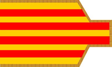 La bandera más común es la bipartida con cuatro franjas usada en todos los territorios de la corona y que antes ya hemos visto. Una variación aparece en una pintura de Lluis Mata.
