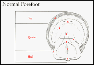 Horses hooves grow approx. 0.25 inches a month and take nearly a year to grow from coronet band to the ground.