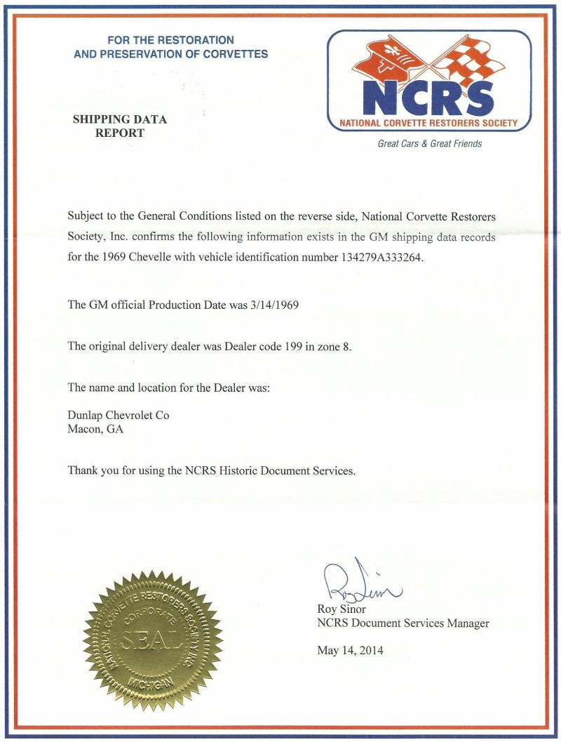 being Dunlap Chevrolet of Macon, Georgia. Copy of this NCRS paperwork is shown below.