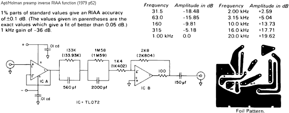 Much work has been done on RIAA equalisation, those repeatedly refered to are the contributions by Baxandall and Lipshitz. Some PDFs of these have been kindly contributed and will be made available, where possible, on request. Recommended also are some JLH designs and the extensive work done by Tomlinson Holman. A detailed discussion, together with a proposed design that some may consider complex, is offered by Dimitri Danyuk and George Pilko (Kiev 1988-'90). Stan Curtis' System A (copies of scans of original article which contained some errors is available on request) used a modular approach to meet individual needs and 'discrete component operational amplifier's using selected devices. More than 65 different MM and MC preamps are shown below, detailed discussion of which is avoided to save space and not to deter new-comers to the subject. John Curls' work in this field is notable, however, some designs proposed are heavily dependent on the close matching of active elements.