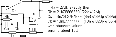 The addition of a buffer to prevent overloading the output filter is recommended and a higher value resistor between the switch wiper and the opamp output will reduce the possibilities of instability when the feedback path is momentarily open-circuited during switching if a make-before-break switch is unavailable.An earlier house-publication intended to promote the use of opamps for audio (application Report B80, Texas Instruments Ltd) had given rise to some compact designs.