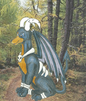 aginst her back. A white cresent mark could be seen on her forehead, along with a scar that layed across her rght eye. A long forked black tail was held high and motionless behind her. She was known as Heruga ((or Houndoom)) But was far different from others of her kind. Heruga don't have wings,..but the differences didn't stop there..... ((Winged houndoom is © M0onfade all rights reserved!!))
