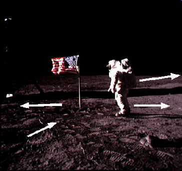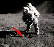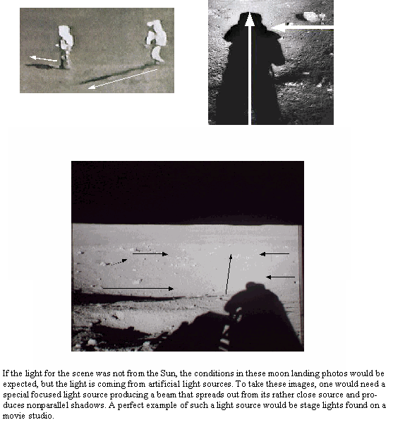 Notice how in the picture to the right, the astronauts have two shadows rather than one. For an object to cast two identical shadows as seen in this picture, two powerful light sources would be needed. If we are to believe the sun was behind the astronaut in this picture, then the moon's reflection would have been traveling in the opposite direction, and the two would have canceled each others shadow. With only one light source direction, it proves this picture was not taken on the moon, but here on earth in a movie studio.