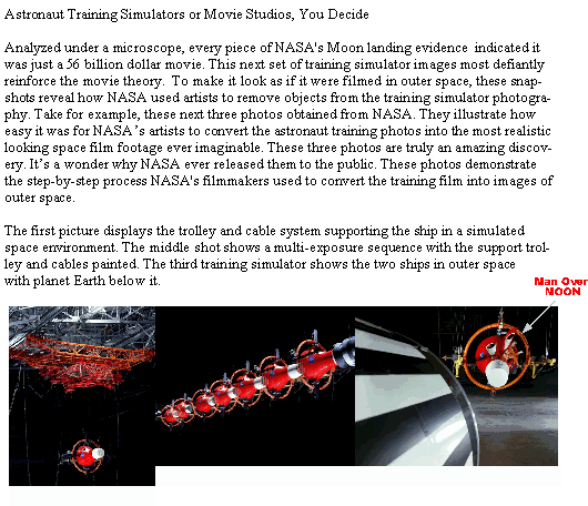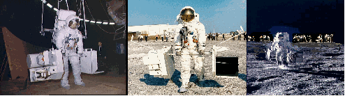 The sample below shows how easy it was for NASA to convert the training simulator photography into an authentic looking space film footage. The picture on the left is the original NASA training photo. Beside it, is a copy of the image showing that the ship levitation harnesses were covered up. Take a close look at the astronauts climbing out of the ship without his space suit on. Does it look like he is about to jump back down to Earth, or is he in a training simulator.