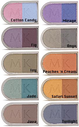 The new eye colors (singles) are: Adobe, Cinnabar, Copper Beach, Currant Craze, Gold Leaf, Lucky Penny, Moonstone, Persian Spice, Raspberry Rush, Rose Mist, Sheer Pink, Storm, Vintage Gold, and Virtual Violet. The new eye color duets are: Cotton Candy, Fig, Jade, Java, Mirage, Peaches 'n Cream, and Safari Sunset. They will cost $6.50 each.