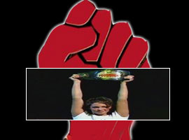 “That ay be true, but not in this case… plus you’re fat and I enjoy your suffering way too much and the more I talk and voice my opinion the more you in fact suffer.”Tank turns slowly with a sly smile forming across his face, ear-to-ear. Tank walks up to Bischoff and lifts him up by his dyed-black hair and goes to deliver a closed fist right hand but Bischoff low blows Tank and backs up watching Tank drop to his knees holding himself, a smile on his face now. Bischoff jumps back at Tank and hits a sidekick right to Tank’s face. Tank falls over on his side motionless as Bischoff holds up his arms with a big grin on his face. The fans all boo and soon begin an “Asshole” chant all through out the F.S. Kirov Stadion. Eric Bischoff lifts up Tank and pulls out a pair of handcuffs from his GI and goes to handcuff Tank to the side of the cage.