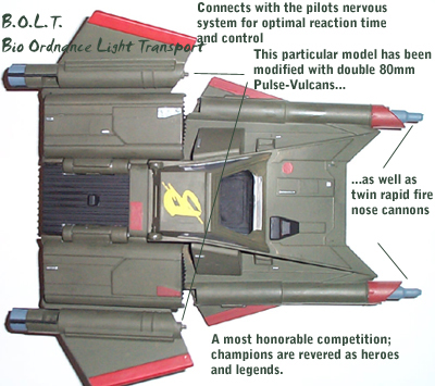 The Bolt was pretty much a straight repaint of a Star Wars expanded universe Airspeeder. I clipped the front guns and removed some undercarraige junk, but the vehicle itself is pretty much the same with some more paint added.