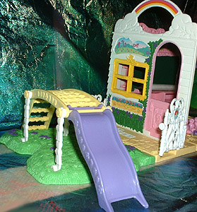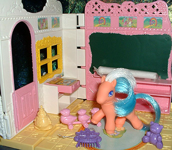 school room and playground, chalk, pink duck toy, yellow clown, purple