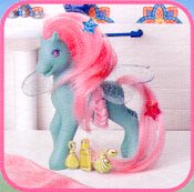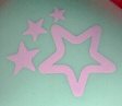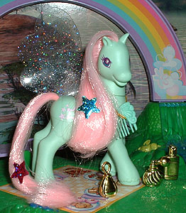 shampoo bottle, lotion bottle, two star hair decorations, and mint green