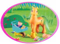 broom, orange spade, blue/silver shovel, green apron, and orange comb
