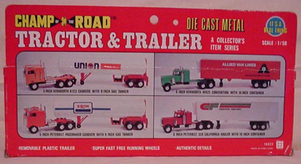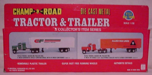 1976- The Humble BeginningIn 1976, Universal Associated introduced a lineup of diecast tractor trailers to the marketplace. They started off slowly at first (with only two combos), and gradually increased the varieties to include more than 20 combinations.The cabs were diecast metal- a zinc mixture, including other inexpensive metals. The first year saw four cabs- a) Peterbilt cabover painted dark orange b) Kenworth conventional painted green c) Peterbilt conventional painted red d) Kenworth cabover painted light orange