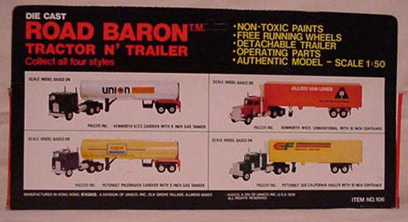 The tractor/trailer combinations also got a major workover. First off was the new packaging. A black, red, and orange box quite similar to the one they had been using, but with "Road Baron tractor n' trailer" emblazoned across the rear flap. Other changes included the Exxon tanker, and the Consolidated Freightways refrigerated van being molded only in yellow. The curious note to this is that the Union 76 tanker stayed in white. Strange, if I do say so myself. The cabs also took on a new color scheme during this transition. However, the cabs noted here could not be had individually. The only way to acquire them was to purchase the tractor/trailer combination. The Peterbilt Cabover could now be had in dark blue with the Exxon tanker, and the Kenworth cabover could also be had in dark blue, but only with the Union 76 tanker. The striping on ALL of the cabs was discontinued at this point, but that was not to last for long. |