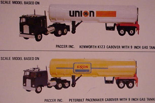 1978- The Year For Changes....In 1978, a few changes were made to the lineup. The most noticeable change in appearance was the new color for the packaging. The boxes were originally red with a blue stripe running vertically through the left third of the carton. This year they changed the base color to blue, with a red perimeter stripe. The lettering also changed to a shadowed block lettering, from the original 'typewritten' style of letters.In '78, they changed the description on the box from actually calling the truck what it looked like (Kenworth, or Peterbilt) to "a model BASED on the Kenworth, or Peterbilt". I would guess that they ran into a licensing problem. Because these trucks were not licensed, the Peterbilts were soon called "Pacers". They could not legally call them "Paccar", or "Pacemaker cabover" as Peterbilt did. However, they were identical to the real thing-The Pacer had the roof mounted air intake, the typical "Peterbilt" grille, and the exact shape and design as the actual truck. The next item that changed was that the cabs got some striping. Cheap, adhesive-backed paper striping. The decals on the cabs wore out very easily, and lifted at the edges quite readily. This however, was not a malady of the decals on the trailers. The decals on the trailers were made of high grade plastic-ask anyone who ever tried to remove them! The trailer decals were of an exceptional quality, and most surviving trailers still retain their stickers. (The only notable mention being the Watkins trailers. They were made with the inexpensive paper decals, and many have come off with the years.)