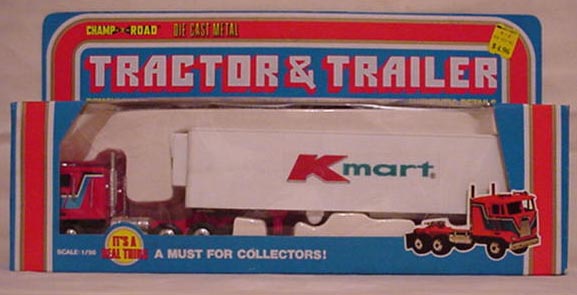 There was also an addition to the model lineup. New for 1978 was the official K-Mart truck! The cab was the Kenworth cabover painted red, with blue and white stripes on it. The trailer was a white refrigerated trailer (probably a bare Consolidated Freightways trailer) with a bold "K-Mart" logo centered upon it's flanks. This was not uncommon in the day, as K-Mart had many of it's diecast suppliers emblazoning regular run units with the store's moniker, and then offering them for sale beside the store's normal diecast selection.