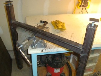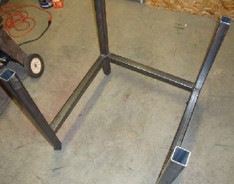 cuts of the 2" square tube with no mistakes. The base of each leg is 'capped off' with a 2" square plate with a 1/2" nut welded to it. The nut and plate allow a threaded rod