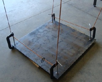 The steel plate top is 36"x36" and 3/8" thick. I paid about $120 for this piece, again from the local supplier. After the frame was complete, it was time to get the plate up on top of the table. The plate weighs around 100 lbs I'll bet. I didn't have any help, so I used the storage hoist that is mounted on the ceiling of my garage. This hoist has all kinds of uses including taking the hardtop off my jeep and hanging dead animals on so I can get them cleaned up for me eating them - yum! My wife likes nothing more than coming out to the garage and finding a big 'ol deer hanging from the ceiling. I used a C-clamp on each corner of the plate to secure the lifting ropes. Then I used my 1/2" cordless drill to power up the hoist and lift the top into the air. After the top was at sufficient height, I pushed the frame underneath and lowered the hoist. The plate is not flat of course (and neither is the frame!) but they were close enough. Then I C-clamped the top to the frame and welded it into place.
