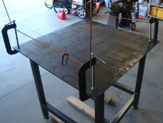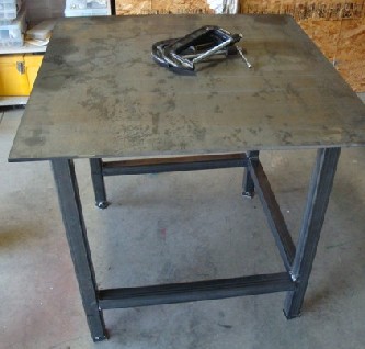 plate with 3/8" thickness for the top. I made the frame 6" shorter than the plate so the plate would overhang each edge by 3". This allows easy clamping of the welding
