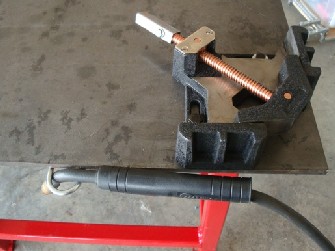 I welded on two 'U' bolts to the underside of the table top for welding gun holders. I also drilled and tapped 2 pairs of 3/8-16 holes for mounting the 90 degree welding vise. The two pairs of holes allows me to choose between two mounting options depending on what I'm welding and how I want the work piece supported. I also replaced the 'T' style handle on the welding vise because it's pretty much useless when mounted over the table. I bolted on a 3/4" square tube for the handle instead. If more gripping power is required, I'll just put an adjustable wrench on the 3/4" tube handle.
